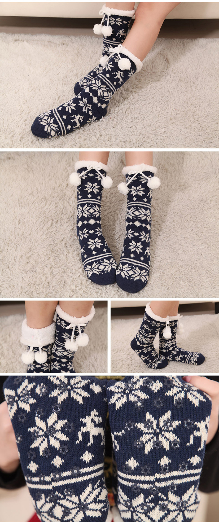 This winter knitted socks featuring pretty snowflake print, thick fleece liner, so warm and comfortable to wear. Item code: HG12118 Minimum quantity: 1 piece. Color: Blue. Size: one-size. Material: woolen.