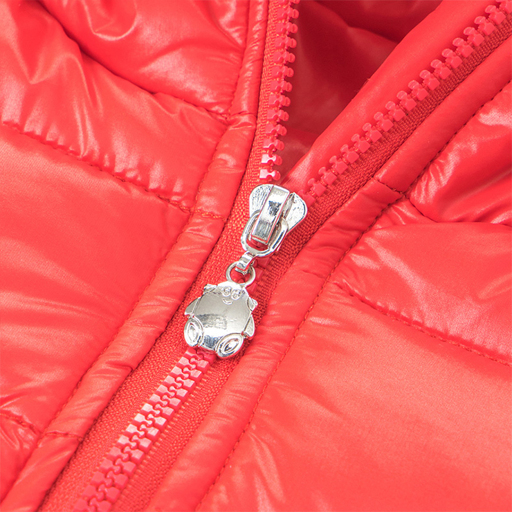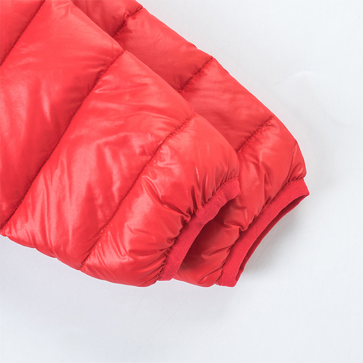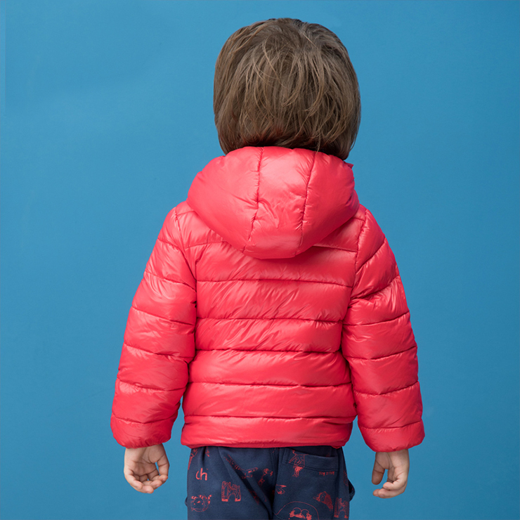 Boys Puffer Jacket in red boasting a smooth feel and lightweight design, filling with high-quality duck down to protect him from cold, the water resistant design comes with side pocket and a full zip fastening, candy color lighting up the cold winter, a padded hood adds extra warmth.