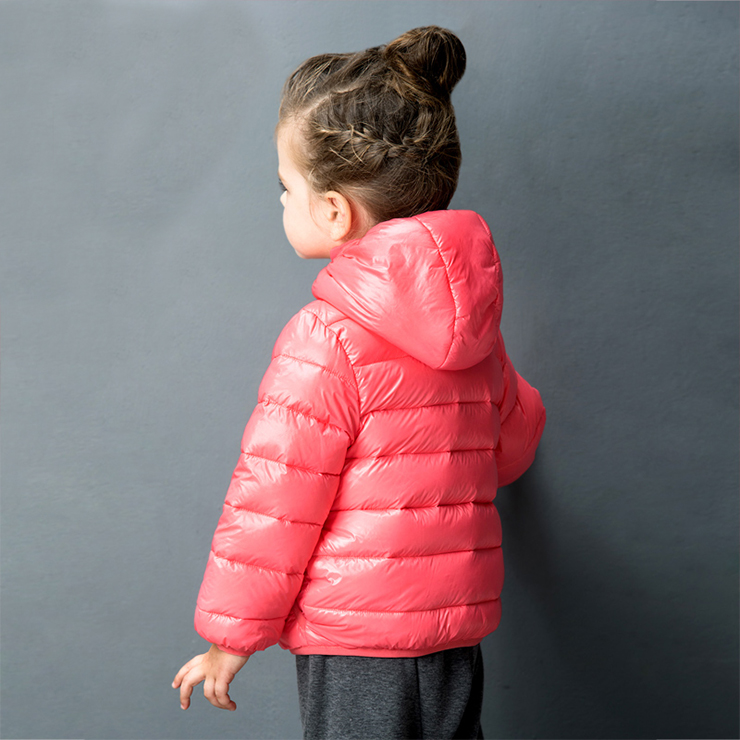 Girls Orange Red Puffer Jacket boasting a smooth feel and lightweight design, filling with high-quality duck down to protect her from cold, the water resistant design comes with side pocket and a full zip fastening, candy color lighting up the cold winter, a padded hood adds extra warmth.