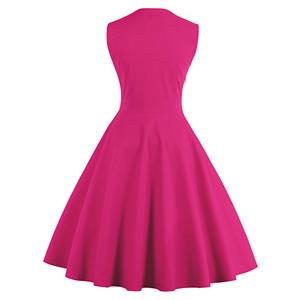 This vintage style patchwork swing dress featuring classic polka dot patchwork, unique neckline design, decorative black buttons on waist, high waisted A-line skirt with swing hemline, concealed zipper closure at side. Great for daily life, wearing to work or cocktail party.