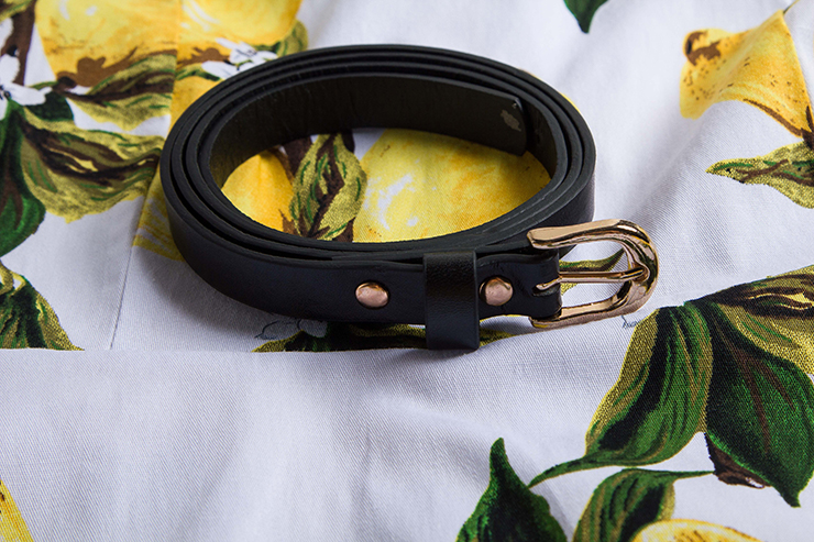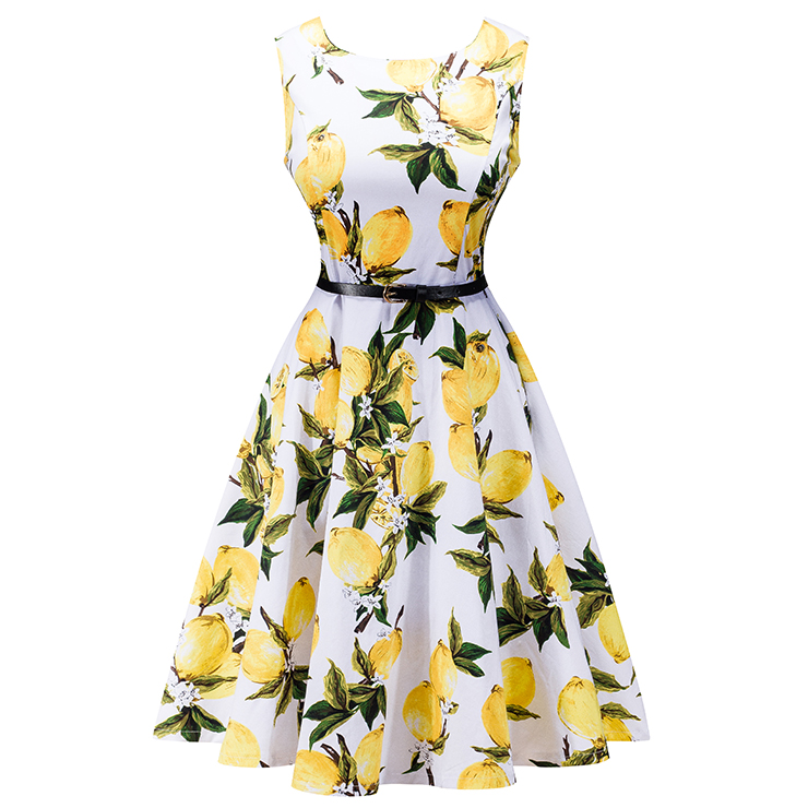 1950's vintage dress is fresh in lemon pattern, with modest round neck design, A-line swing skirt looks so charming, concealed zipper closure in back, matching waist belt.