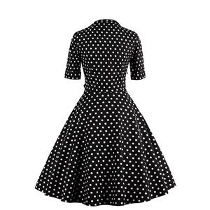 This vintage swing dress featuring classic polka dot pattern, attached with black half sleeves, black large bowknot accent on bust, unique neckline design looks so charming, side zipper closure for convienience.