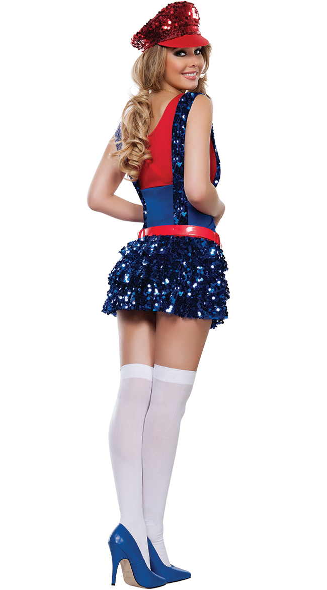 5pcs, Sexy Block Jumping Plumber Costume, featuring a blue sequin suspenders skirt with a blue and red crop top, matching a red waist belt, a mustache necklace, a red sequin cap, and a pair of white gloves. (Stockings and shoes not included)