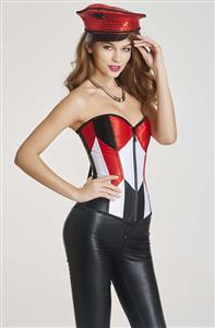 Women's fashion sexy strapless overbust corset, with mix black, white and red design, zipper-closure at front, black ribbon lace-up back for cinching, g-string and red sequins hat not included.