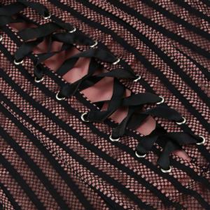 Gothic sexy dark-red strapless corset dress, with stripe pattern overlay the whole dress, built-in boning supported your body, black lace buttom hemline, zipper-closure in side, ribbon lace-up back for cinching. fit for party wear, casual wear, costume, fashion show or other occasion.