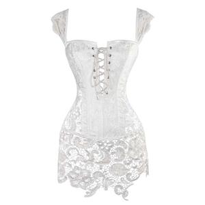 This is a boned overbust corset used white satin material which makes it look gorgeous and elegant, with busk closure front and lace-up back, embellished with stripes, matching g-string.