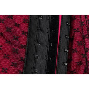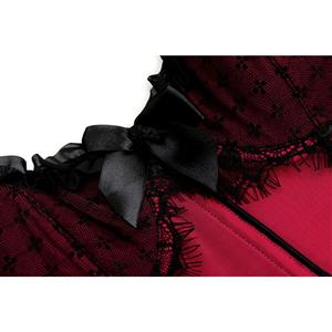 This sweetheart overbust corset has a pretty wine red color, adjustable spaghetti straps, bones for surporting your body, ruffle trim bra with underwire, 2 rows of hook and eye closure back, lace and bowknot details (corset only included).