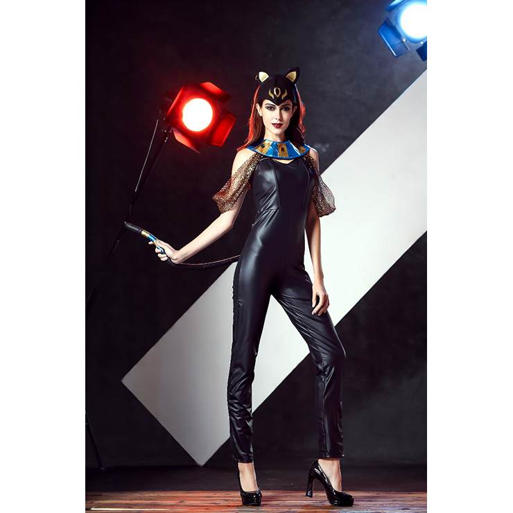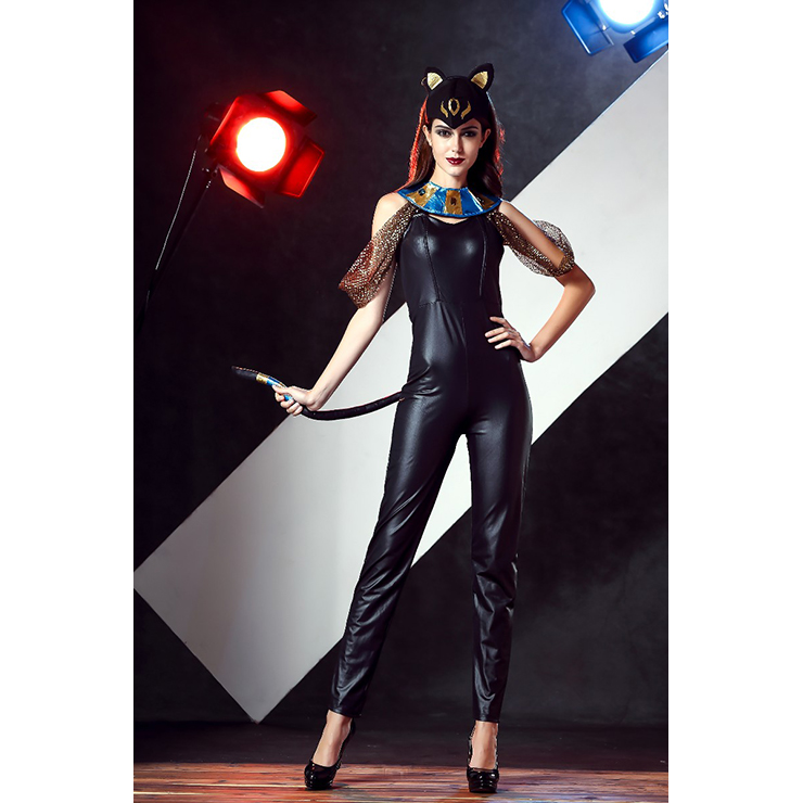 The Egyptian Cat Goddess costume features a body hugging catsuit with tail, sparkling jeweled collar with shoulder drape and ear headband with hoop accent.(Shoes not included)