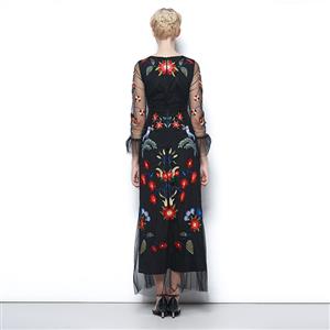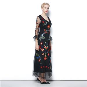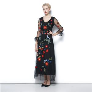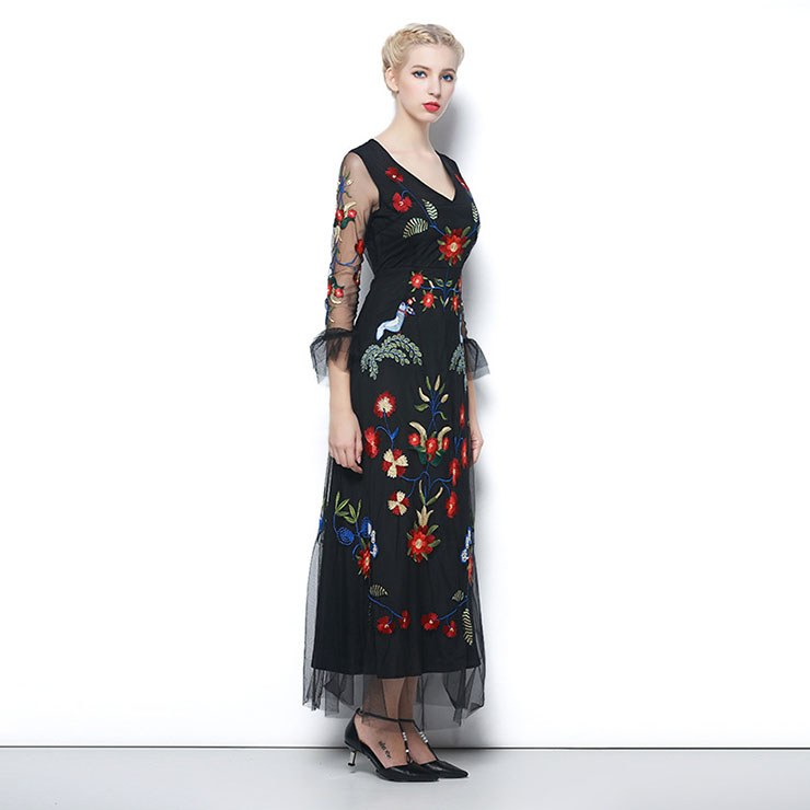This stunning charming black maxi dress,uses high quality lining,soft and comfortable to wear, v-neck design,3/4 half see-through sleeve with ruffle cuff,overlaid with sheer flowing chiffon,vibrant embroidery floral decoration,zipper clousure in back.(shoes not included)