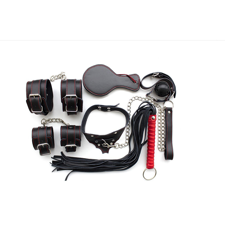 Black Leather Naughty Toy Accessory six set SM props includes whips,handcuffs,collar,paddle,ball gag,ankle restraints.