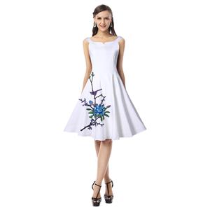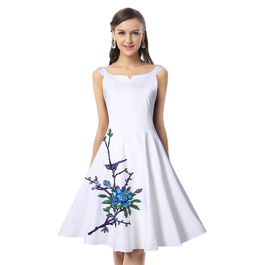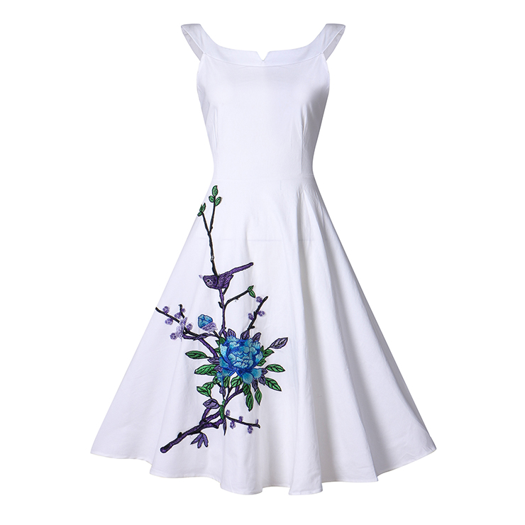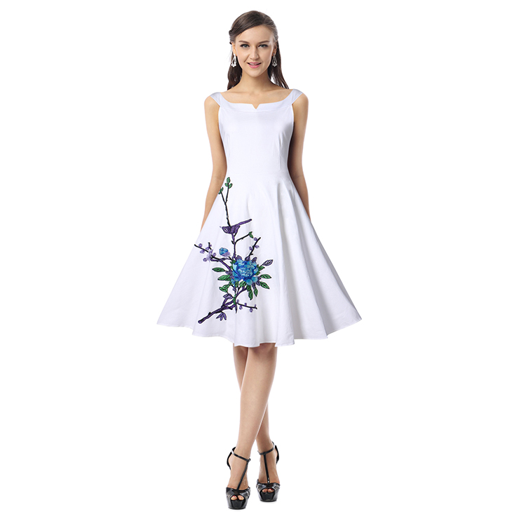 Combining clean lines and a timeless retro dress silhouette,this elegant vintage swing dress is fashioned in a structured vintage 1950s style,high-waisted and wide scoop neckline design show off your slim figure perfectly,beautiful embroidery floral pattern on skirt,looks so charming,concealed zipper closure at side for wearing easily.This gorgeous swing dress is an absolute must for your wardrobe,perfect for dinner,cocktail parties or casual wearing.