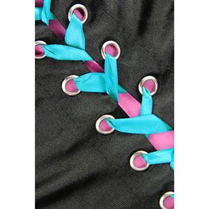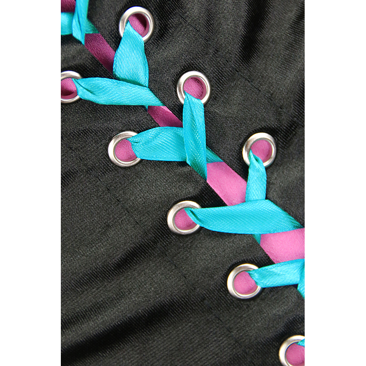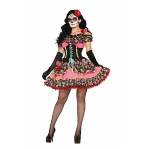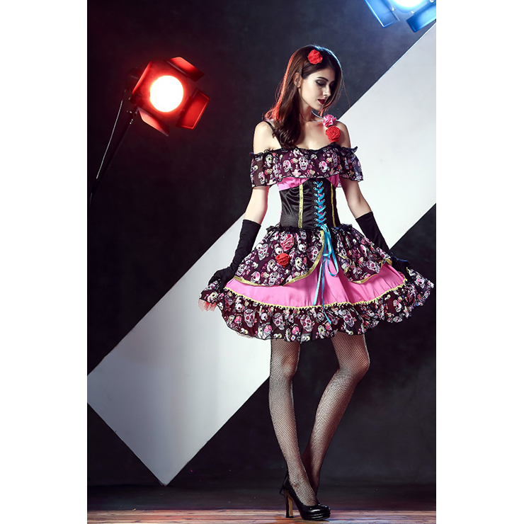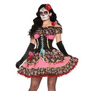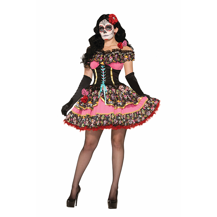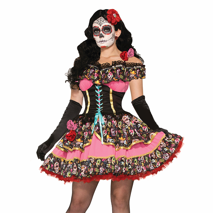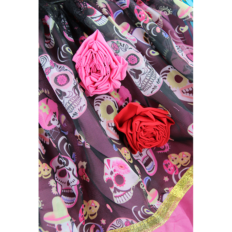 This Day of Death Costume features: skull print black sheer lace across the bodice and overlay on the pink skrit,adorned with beautiful rose on the shoulder strap and the skirt, blue ribbon lacing-up details at front,These Day of the Dead costumes for women are absolutely fabulous for wearing to your Halloween celebrations.Matching a pair of gloves.