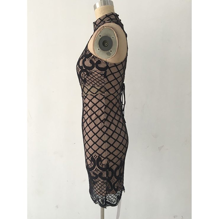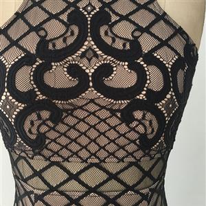 This is slinky dress features nude illusion lining,black lace frayed hem,mock neck design, lace up and center zipper back in curve-hugging fit.
