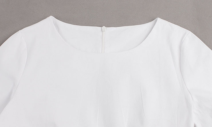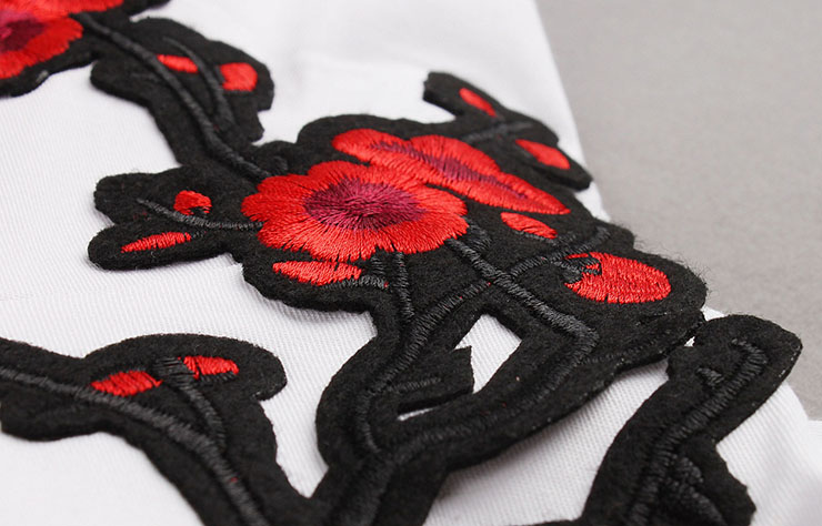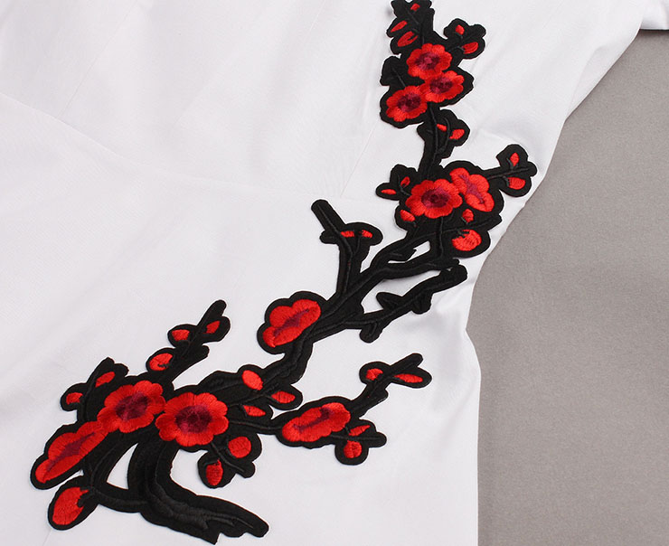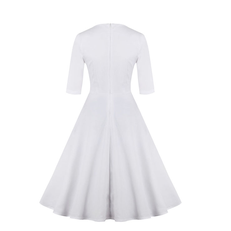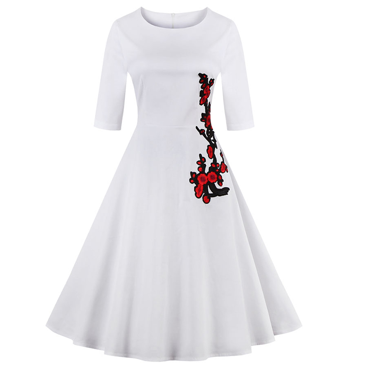 Classic 1950's inspired white vintage dress featuring round neckline and half sleeve design,contrast with embroidery floral print,A-line skirt with unique swing hemline,concealed zipper closure at back.Great for daily life,wearing to work or cocktail party.