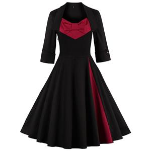 1950's inspired vintage black dress featuring unique turn down collar with blue bowknot joining,3/4 length sleeves,A-line swing skirt and blue trimming,concealed zipper closure at side.Great for daily life,wearing to work or cocktail party.