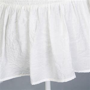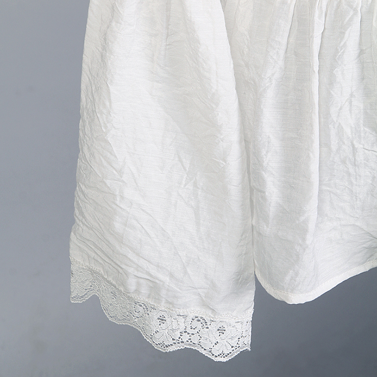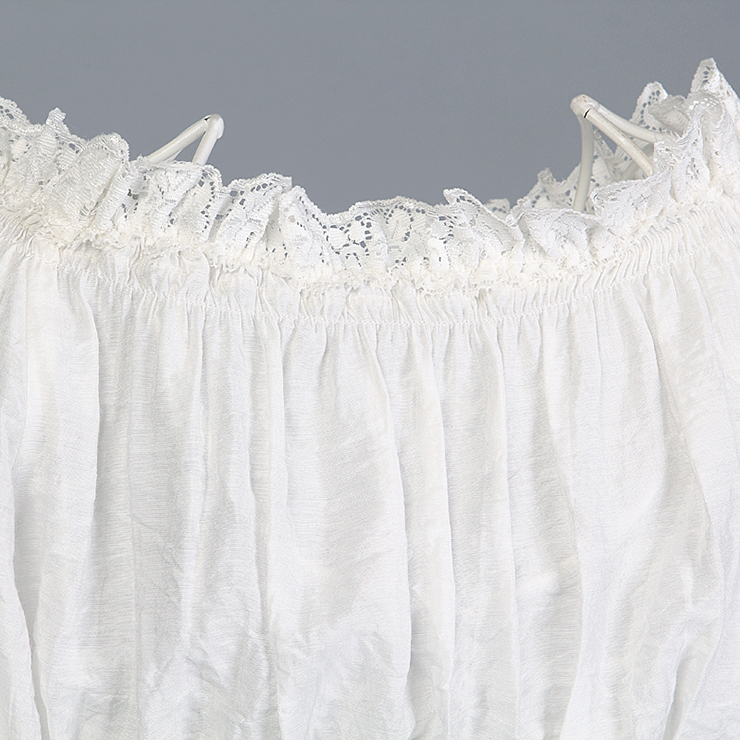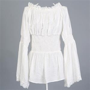This Vintage White Tunic featuring round neckline and cuff trimmed with exquisite lace, sexy off shoulder and pleated empire waist design, retro bell sleeve and ruffle flared hem.