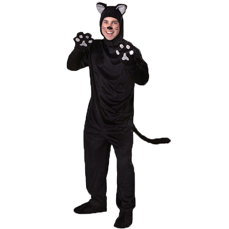 3Pcs. Men‘s Black Cat Adult Costume featuring a black jumpsuit has back zipper, sewn-on faux fur tail and sewn-on ears at hood, matching black mitts with paw pads details and black shoes cover.