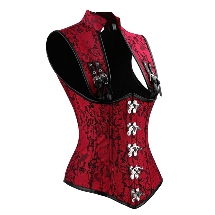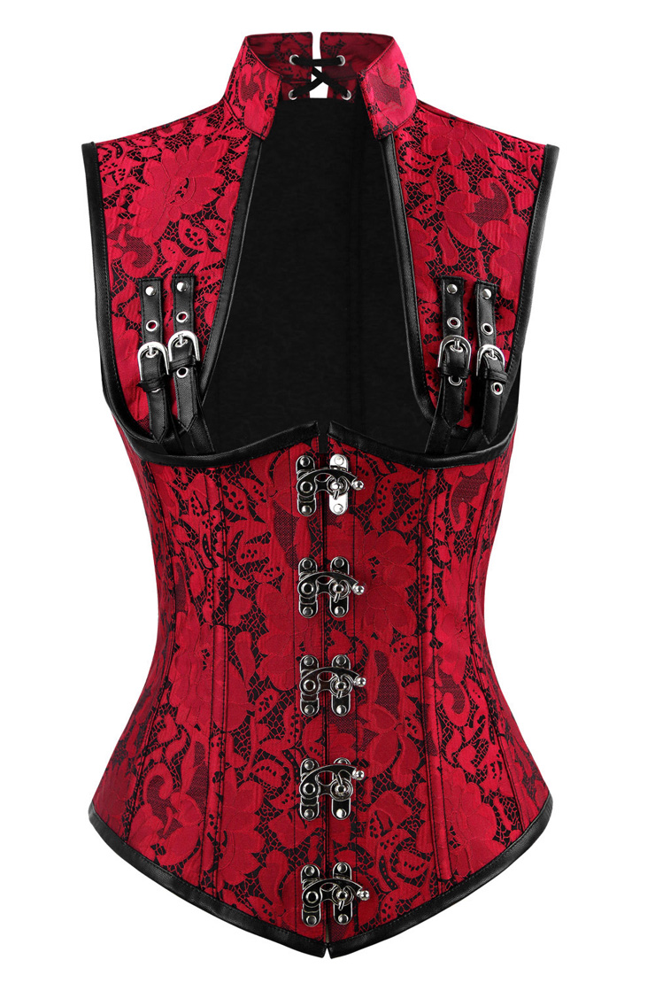 Steampunk steel boned vest underbust corset features: high quality red jacquard fabric overlay the whole corset, two black leather little straps on each side, stand collar design, high quality steel clasp closure in front, lace-up in back for cinching, matching g-string.
