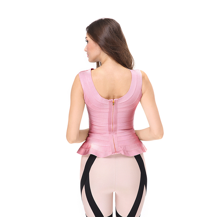 Stylish women's sleeveless top featuring pure pink color, high neckline front and open back design, with peplum hem, made of delicate bandage material that hugs and shapes your feminine proportions, long metal zipper at back. It is a classic style, definitely pair well with any of your skirts as well as pants, perfect worn for casual, spring, autumn, holiday, street, go out, date and daily(Only the top).