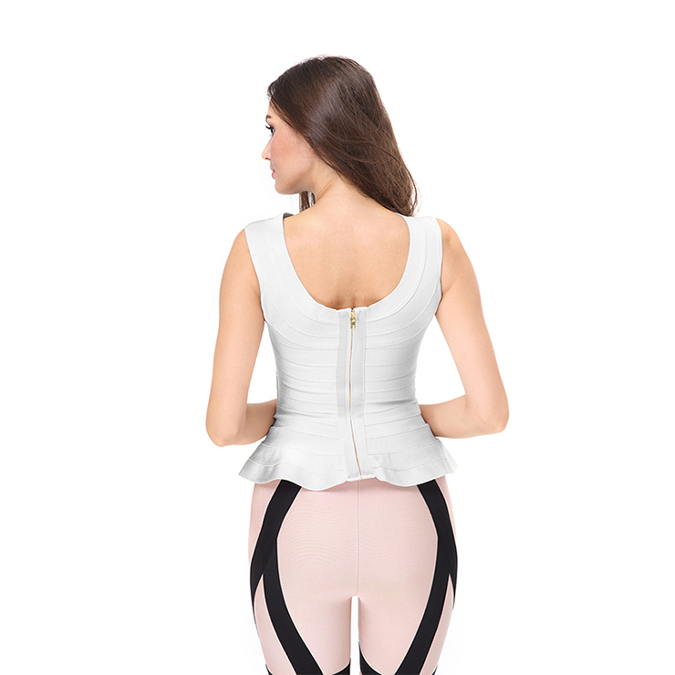 Stylish women's sleeveless top featuring pure white color, high neckline front and open back design, with peplum hem, made of delicate bandage material that hugs and shapes your feminine proportions, long metal zipper at back. It is a classic style, definitely pair well with any of your skirts as well as pants, perfect worn for casual, spring, autumn, holiday, street, go out, date and daily(Only the top).