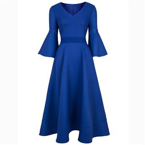 The A-line dress featuring bell sleeve with appliques detail, v neck, solid color, waist decorated with appliques, hidden zipper in the back, blue and mid-calf design make you look elegant and beautiful. Occasions: suitable for party, prom, club, wedding, daily life and more.(Only the dress)