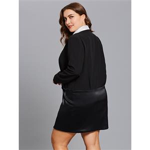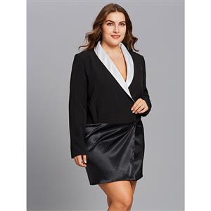 The black plus size coat dress featuring business suit design mini coat dress, deep v neck and long sleeve design, turn-down white lapel, patchwork style, front with a button closure. Suitable for office, go out, vacation, business party, clubs, bar, wedding and more.