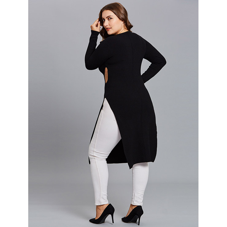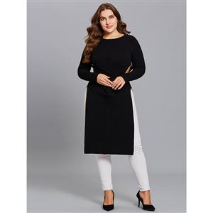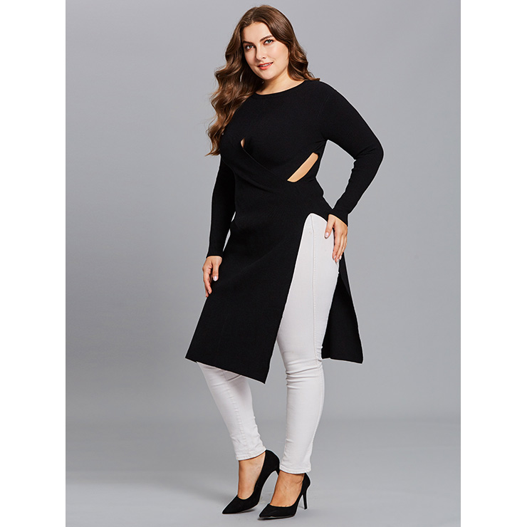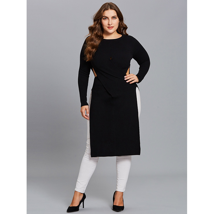 Women's black plus size long sweater featuring round neck and long sleeve, with cut out at two waist side, high split design for easy wear, high quality skin-friendly knitted fabric keep you warmth all the time. This kind sweater is definitely pair well with any of your pants, perfect worn for daily casual, holiday, street, go out, date and office(Only the sweater).