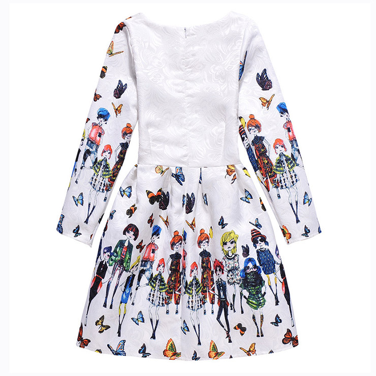 The vintage swing dress featuring comfortable fabric, cute butterfly and cartoon people print, long sleeve, round collar, conceal zipper at back and convenient to wear or take off, A-line design make your girls become a lovely little princess. Occasion: suitable for party, go out, daily casual and more.(Only the dress)