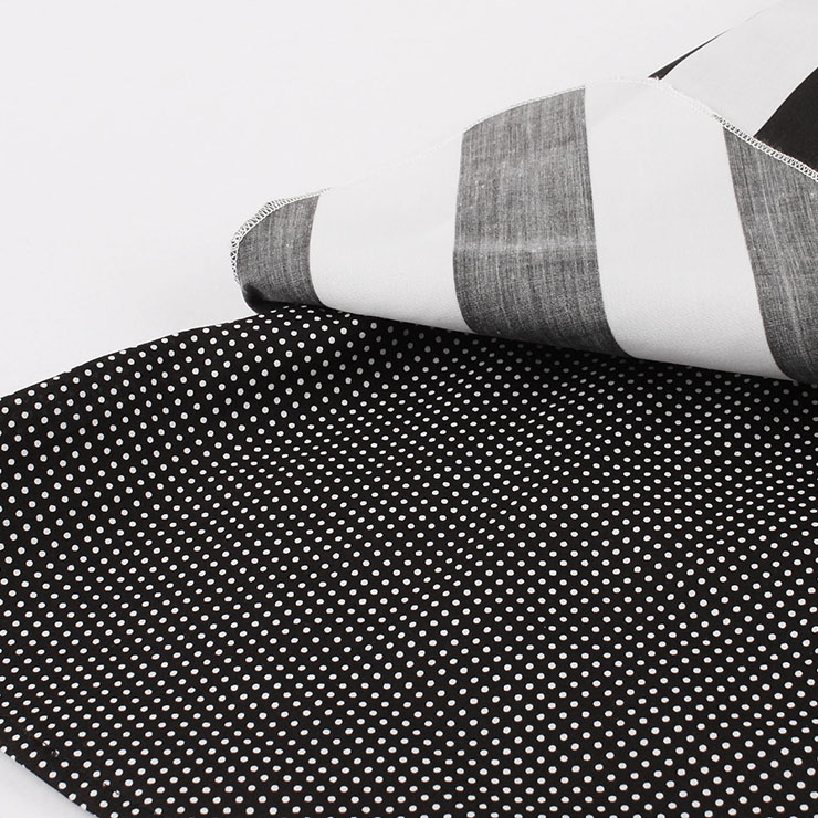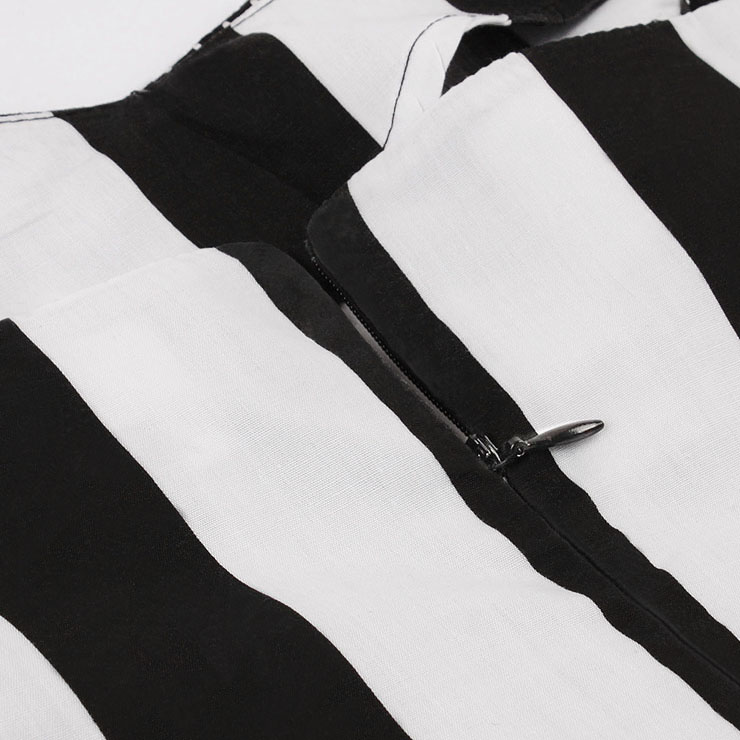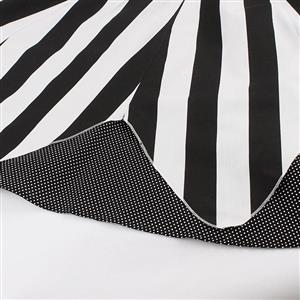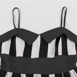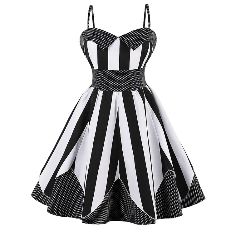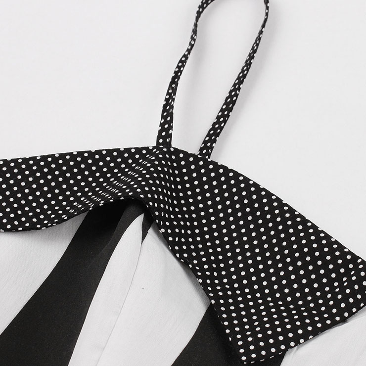 This sexy vintage patchwork dress featuring sweetheart neckline, thin shoulder straps, high waisted A-line design, black and white stripe print, with dot print panel on neckline, waist and dress hem, concealed back zipper closure. Perfect for daily wearing, picnic, outdoors, dating, school and office.