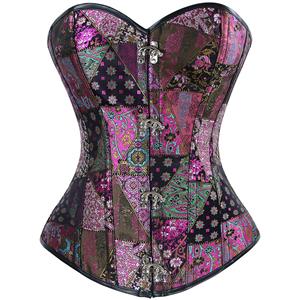 Women's sexy steampunk outfit includes: a strapless steampunk corset features delicate purple jacquard with vibrant pattern, attached steel boning for support, clasp closure in front and lace-up back; Punk style faux leather legging has criss cross metallic chain on two side mesh panel, stretch leather fabric will fit and shape your leg. Perfect for steampunk-themed party and club wear.