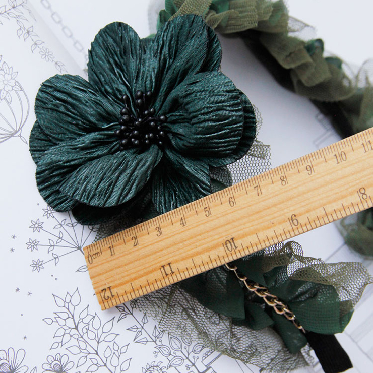 This Forest Elf Green Hair Clasp features a black hair hoop with gold chain, attached with ruched light green mesh and cloth, a large dark green flower accent finish the charming look.