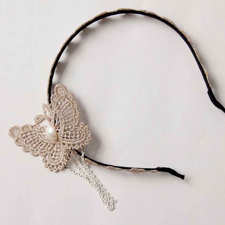 Elegant lace hairband featuring a floral lace butterfly attched with pearl and chains, iron hairhoop is wrapped with ribbon without hurting your skin.