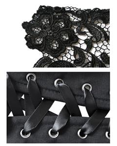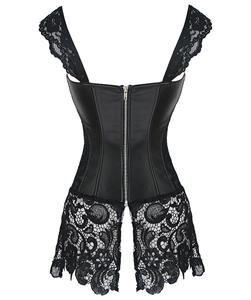 Faux leather and venice lace fully boned corset with lace-up front detail, hi-low attached skirt, lace shoulder straps and back zipper closure. Matching thong included. Lace straps can be worn on or off the shoulder.