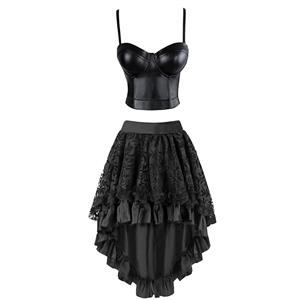 Classic vegan leather bustier, a built-in demi and adjustable strap, hook and eye closure back, pair with lace and satin high-low hem skirt, so perfect for daily life or parties.