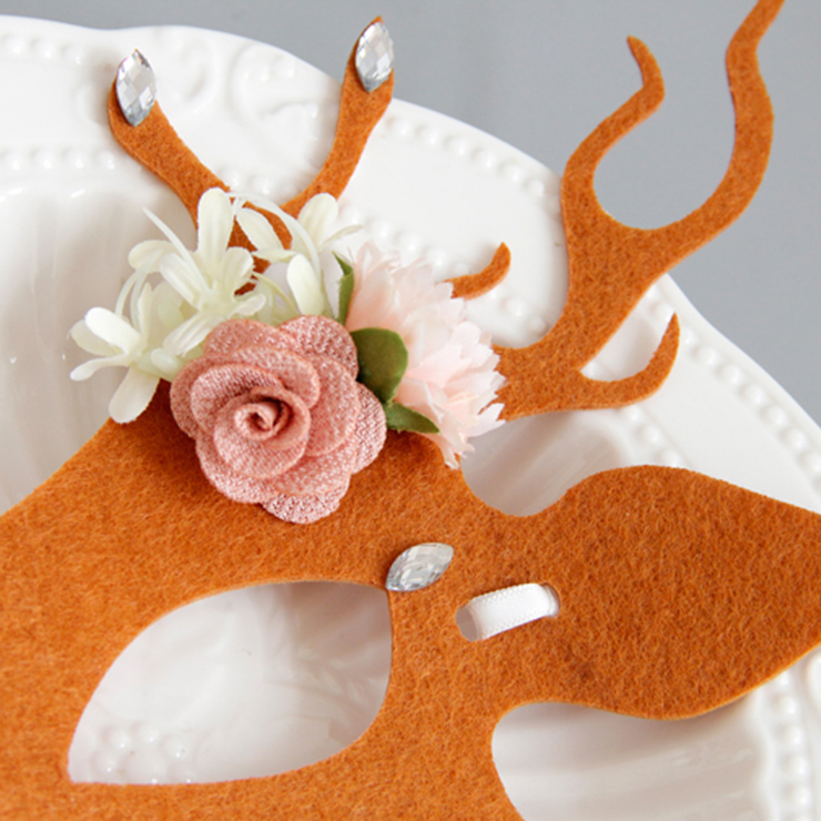 Catch your eyes, the lovely brown elk mask designed to be 1/2 length with resin rhinestone decorate the mask and hand made flowers accents, comes with white adjustable ribbon keep the mask in position, perfect for halloween, masquerade party, events, or just for collections.
