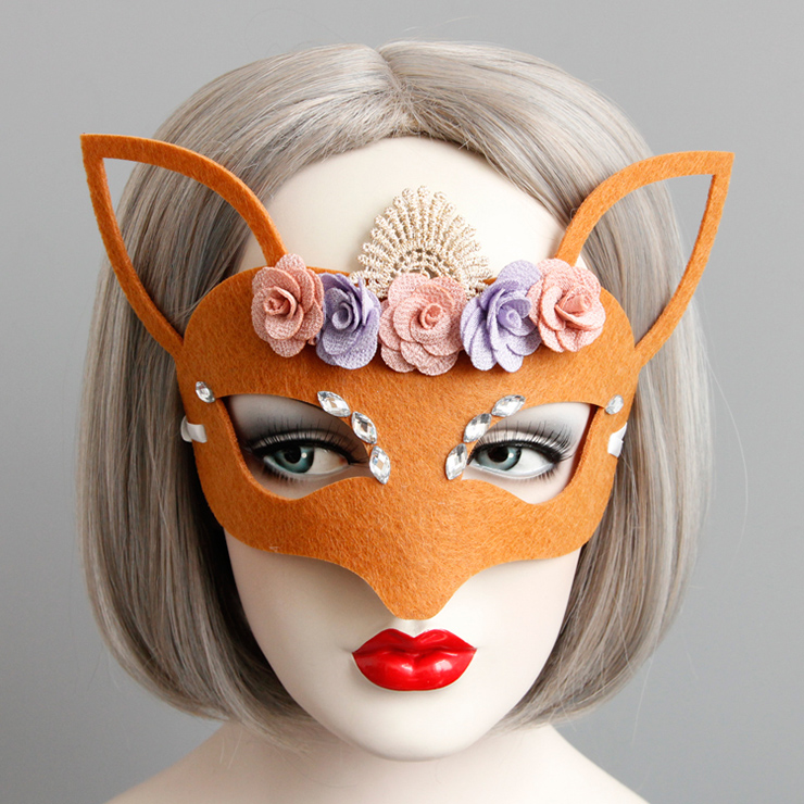 Catch your eyes, the brown cute masquerade fox mask design to cover your half face, with special cut out on ear and resin rhinestone details and beautiful flower decoration, comes with white ribbon keep the mask in position, perfect for halloween, masquerade party, events, or just for collections.