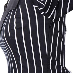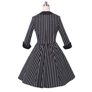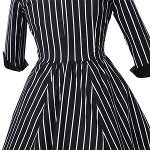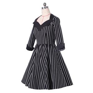This Graceful 1950's inspired vintage black dress featuring unique turn down collar, long sleeves with special turn down cuff, high-waist design ,A-line swing midi dress and white stripes in details, look like more slim and tall, concealed zipper closure at side. Great for daily life,wearing to work or cocktail party.