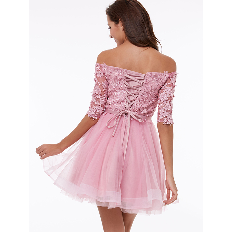 Women's fashion and elegant pink evening dress featuring off shoulder half sleeve design, beautiful appliques on the dress top, see-through tulle dress bottom, with lace-up detail at back. Suit for Prom party, Evening, Wedding,Special Occasion, etc(Only the dress).