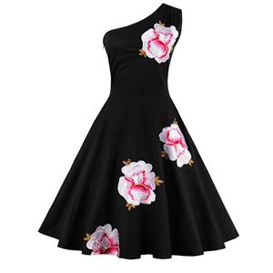 This vintage dress is styled with delicate retro embroidery butterfly pattern, features oblique one-shoulder and other side with thin shoulder straps design that’s so charming, high waisted A line swing skirt makes you look slimmer and taller, zipper closure at side. Suit for cocktail party, outdoor, go to work and other occasions.