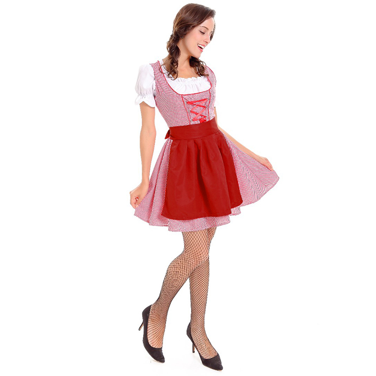 3pcs, Sexy Pretty Beer Girl Bavarian Costume include three pieces: a white blouse with slightly gathered with puffy sleeves, ruffled square neckline, a cute dress featuring with red and white plaid print, ribbon lace up front, concealed zipper at back, and matching red maid apron. (High heel and fishnet stockings not included)