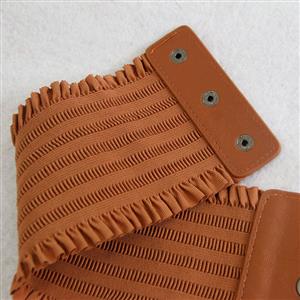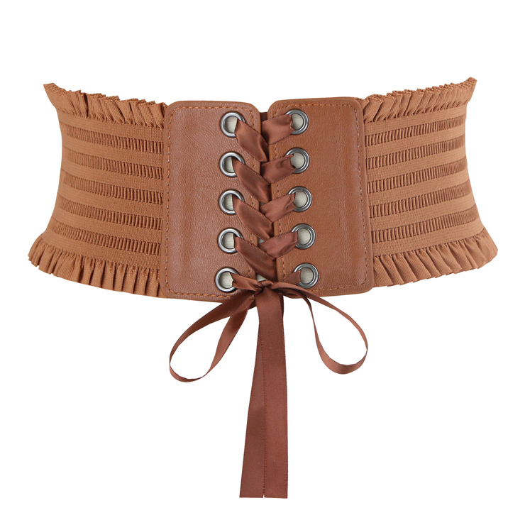 Fashion Cincher Elastic Belt featuring front with high quality leather fabric and ribbon lace up closure, with delicate frill trim, high stretchy ruffled wide band, three snap buttons closure at back makes it easy and convenient to wear and take off. This corset belt match with tunics, long chiffon blouses or dress, it can highlight your slim waist in a very attractive way.