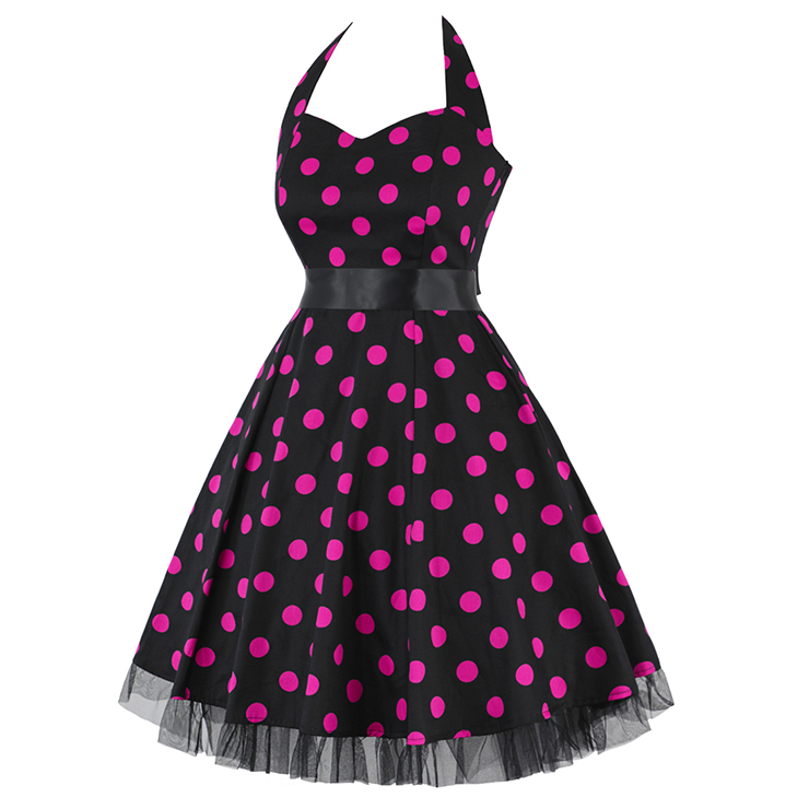 This sexy vintage casual mini dress featuring black dress covered with classic rose polka dot print, halter design, high-waisted and sweetheart neckline, with a black waist band to tie a bow at back, concealed side zipper, slight elastic fabric fit your body perfectly, see-through mesh hemline. Perfect for daily wearing, picnic, outdoors, dating, school and office.