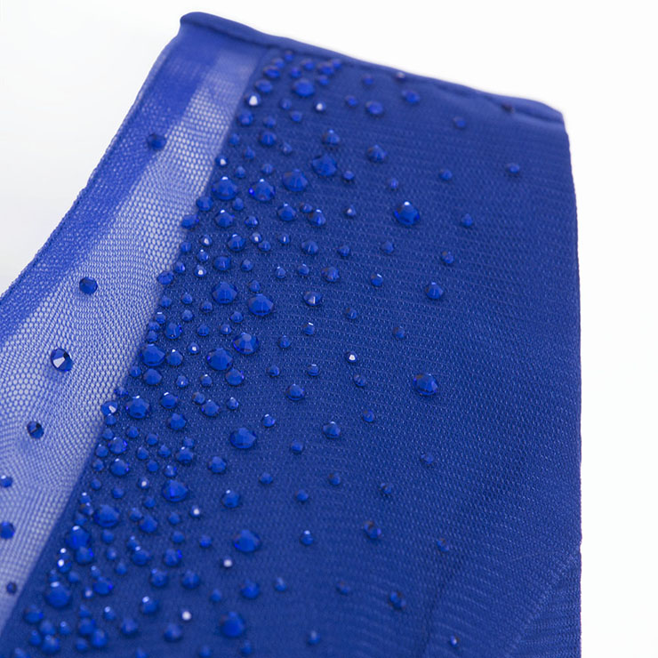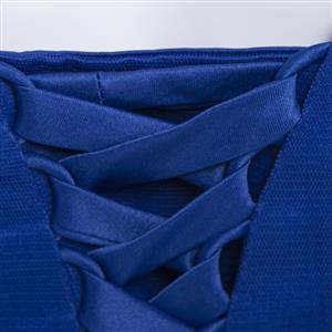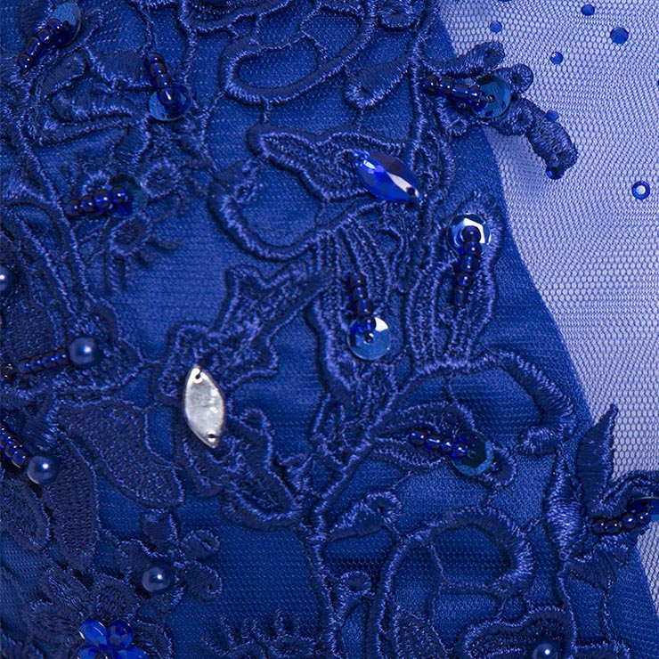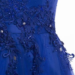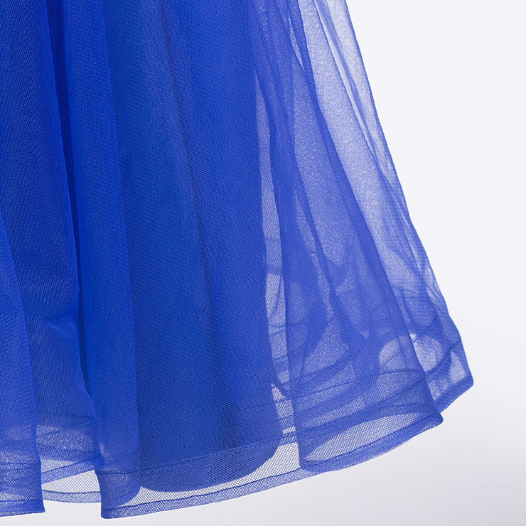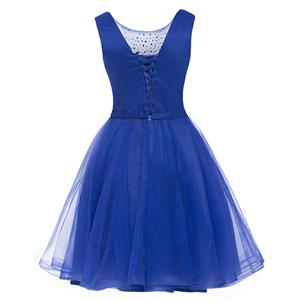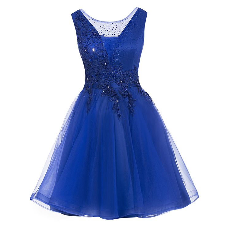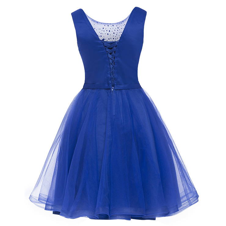 Women's fashion and elegant blue homecoming dress featuring simple round neck and sleeveless design, alluring sheer-illusion mesh on the sleeveless bodice make a deep plunging neckline look, delicate beaded applique spread from shoulder to waist and decorated with countless tiny beads. a small waist belt make a high waist look, lace-up detailing at back, sheer tulle layer at the bottom. Suit for Prom party, Evening, Wedding, Homecoming, School Party, Special Occasion, etc(Only the dress).