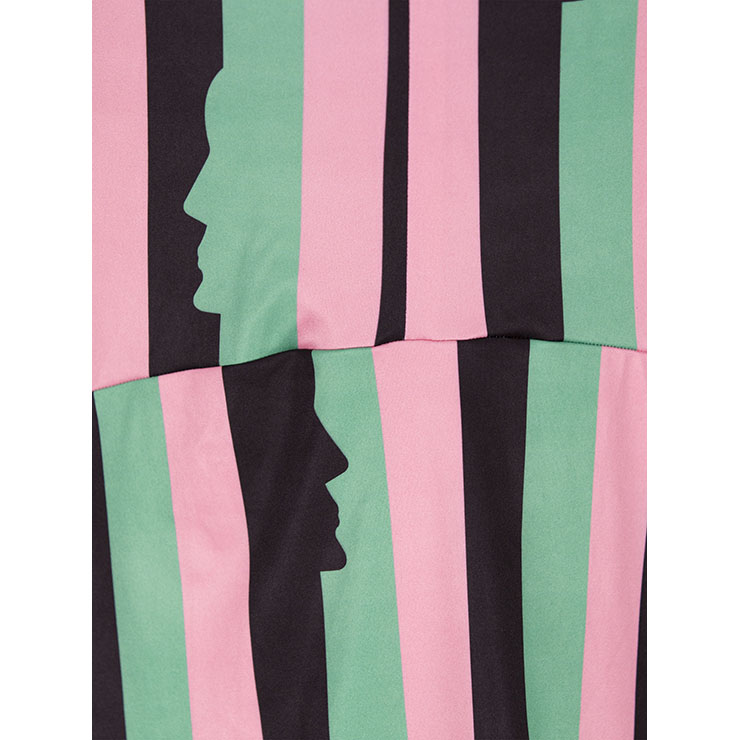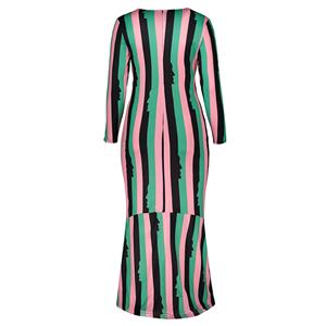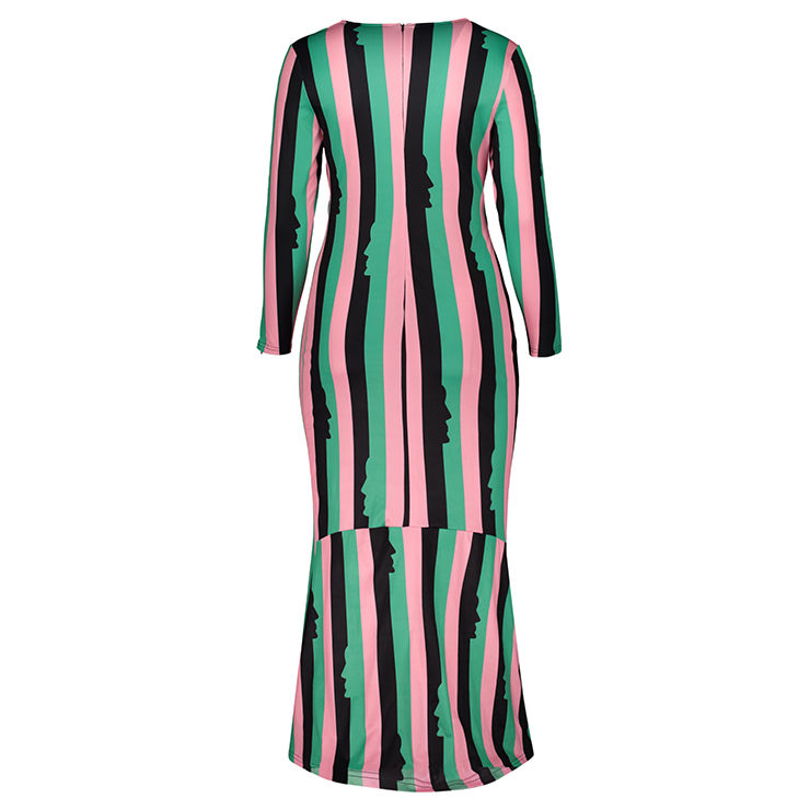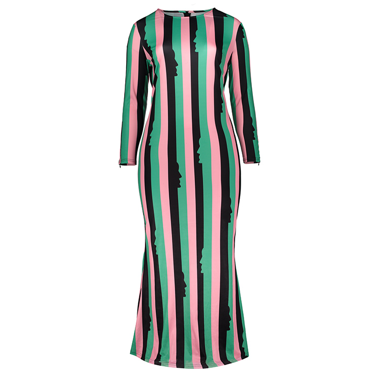 The plus size stripe maxi dress featuring round neck and long sleeve design, floor-length bodycon silhouette, with concealed zipper at sleeves, unique color-block stripe print allover the dress, with some unconspicuous human side face on the dress, hidden zipper at back, slim fitted and unique design make you look stylish and generous. Occasions: suitable for party, date, go out, shopping, daily life and more.(Only the dress)