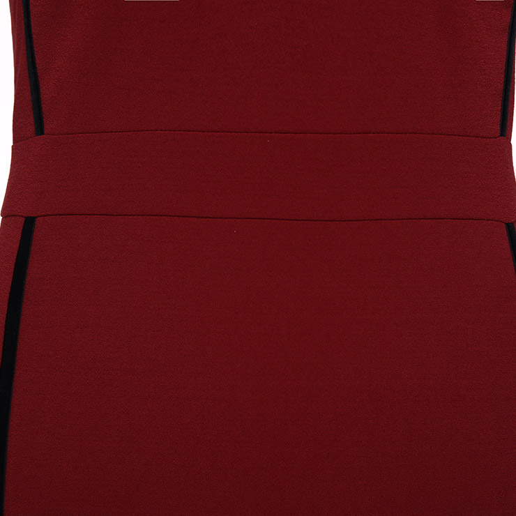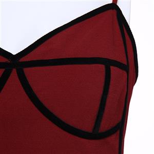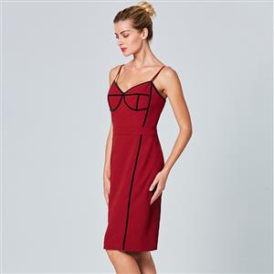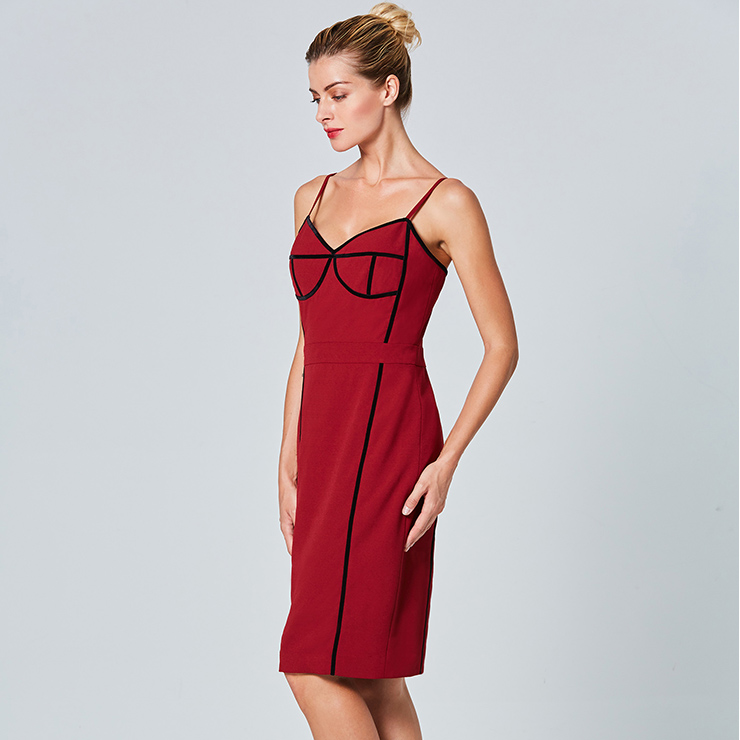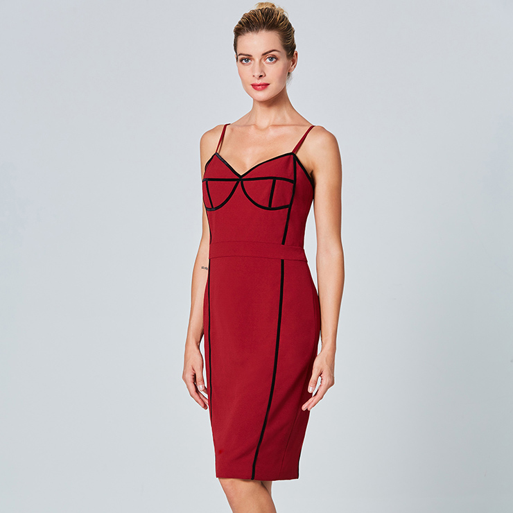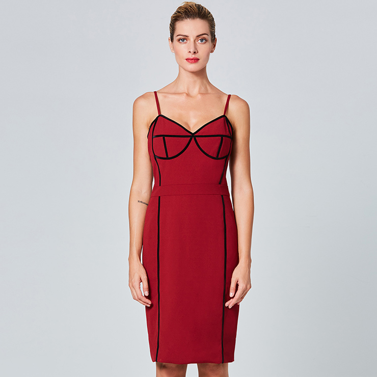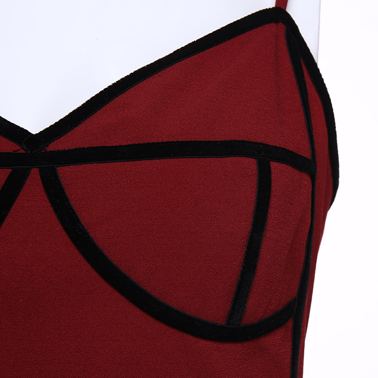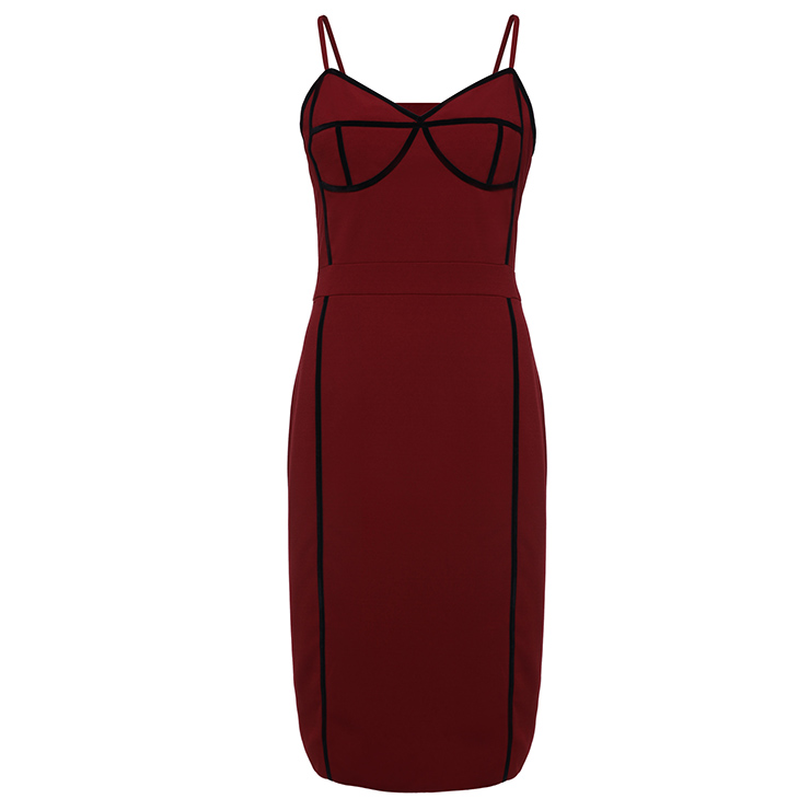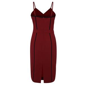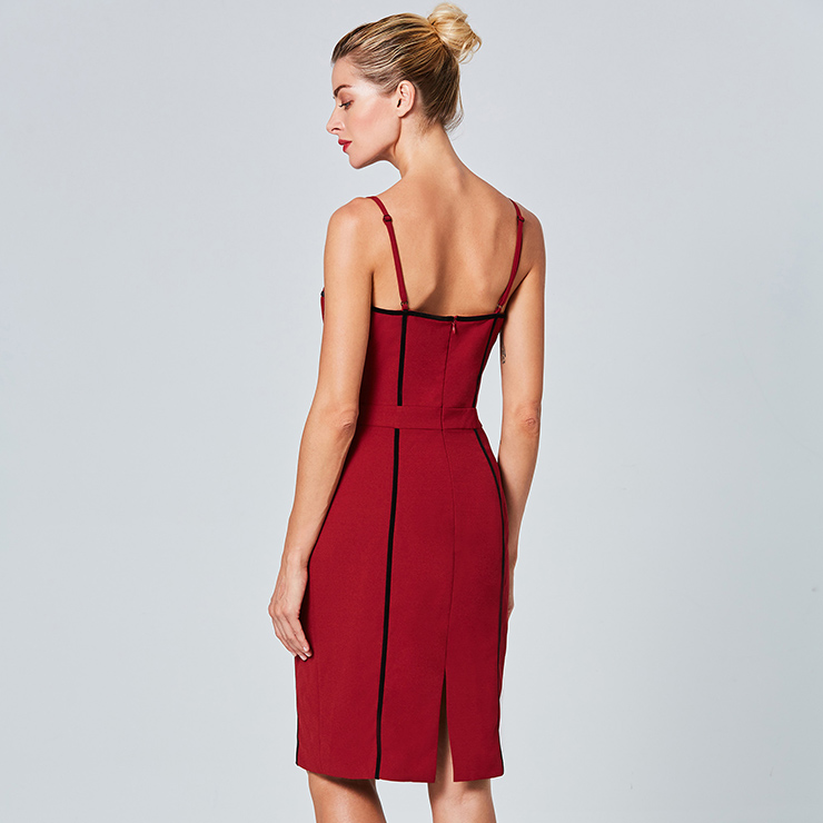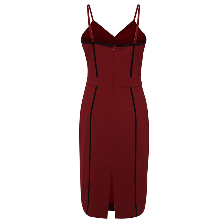 The sexy wine-red sheath dress featuring v neck and sleeveless design, thin adjustable spaghetti straps, contrast black stripes trim design which looks fashion ans stylish, back split detail, concealed back zipper closure. Occasions: suitable for club, shopping, party, date, casual, daily life and more(Only the dress).