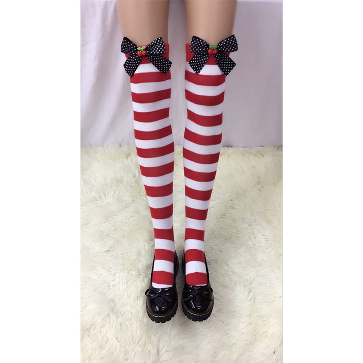 This lovely stockings features: made of comfortable, soft, breathable and stretchy fabric, red-white strips, spots bowknot with cherry and knee length design make you look innocent and charming. Suitable for Cosplay, party, daily casual, dating and more (Only the stockings).