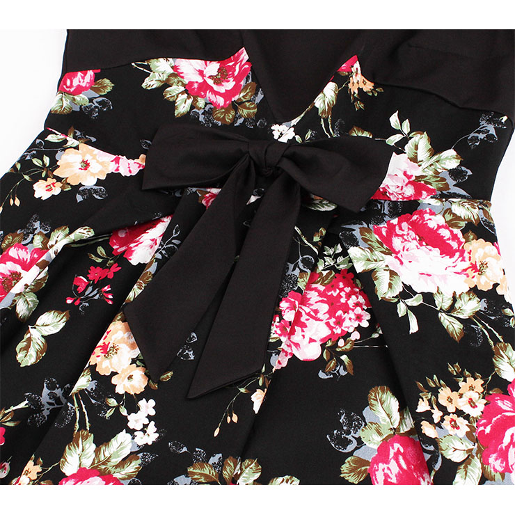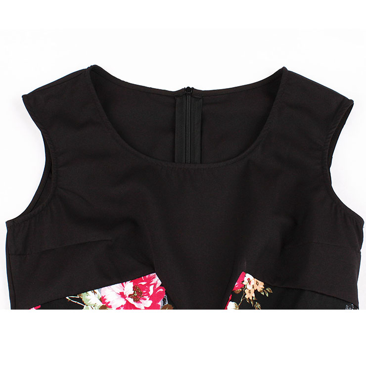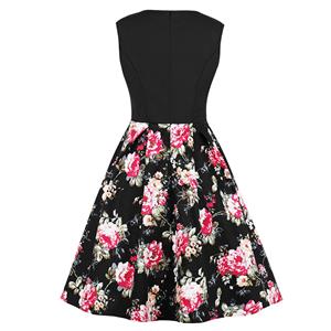 Retro Style Cocktail Party Dress is simple yet elegant, features modest scoop neck and sleeveless, big bowknot stitched at waist, black and floral print patchwork design, A-line swing skirt, concealed zipper at back. Perfect for daily casual, cocktail, dating, outdoor, party and other occasions.