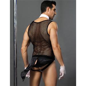 This men's sexy black vest made of high quality, soft mesh, sleeveless and transparent design shows off your body perfectly, matching sexy tuxedo thong with buttons, white collar with black bow tie and white gloves. Perfect for night club, personal party, bar and other special occasion.