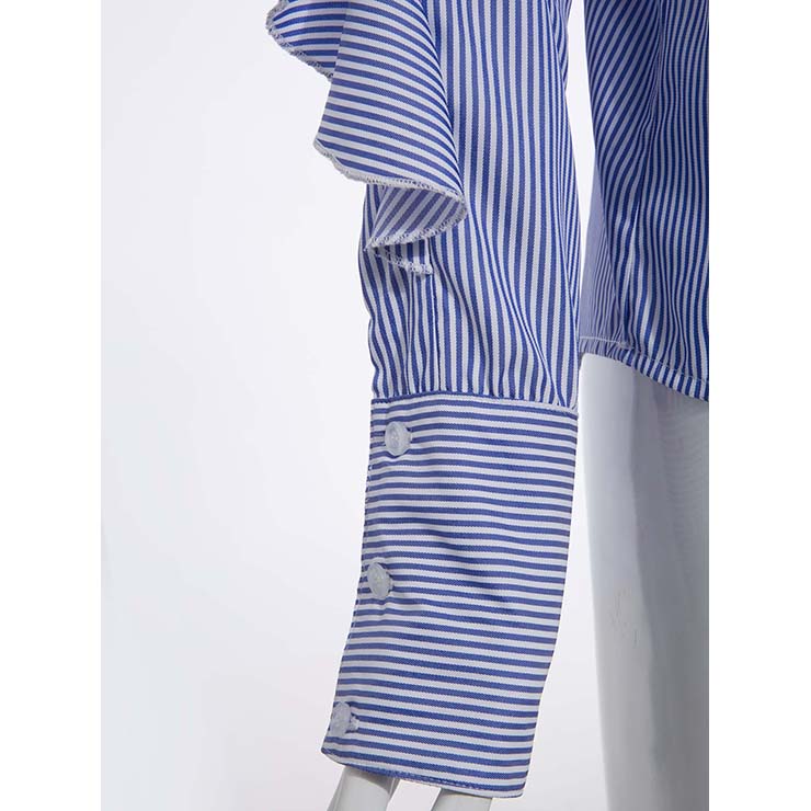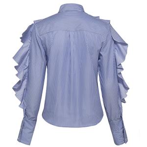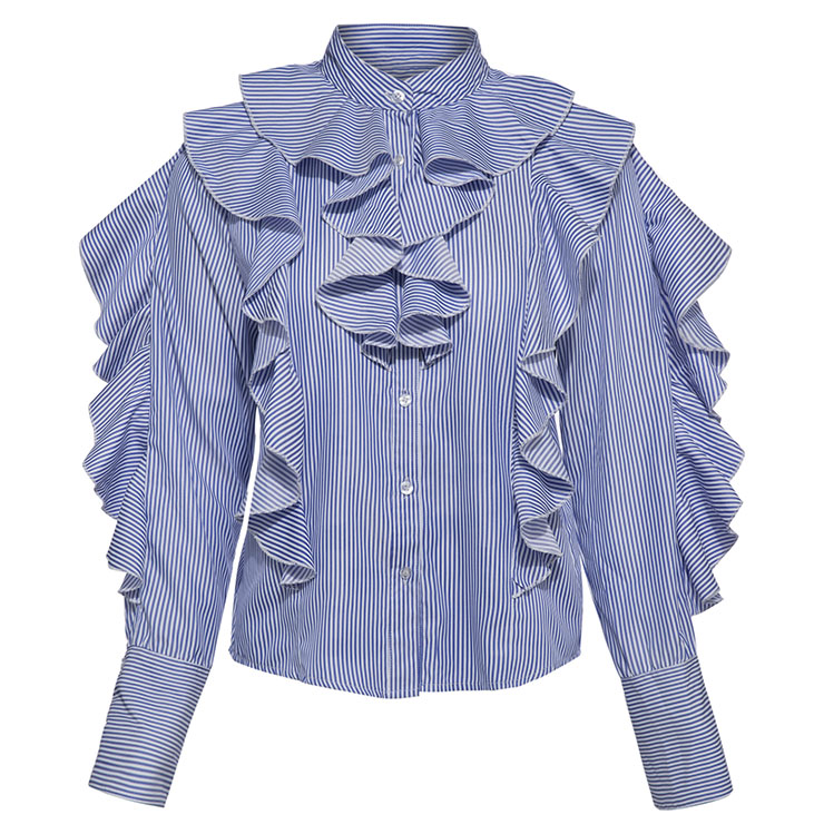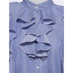 This light-blue blouse featuring stand collar design, long sleeve, with multi-layer ruffled falbala at front, tight cuff with button closure, front button closure. Set off different type of bottom: leggings, jeans, skirts and shorts, suitable for outdoor, dates, fashion show, office, school.