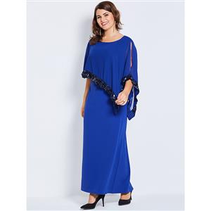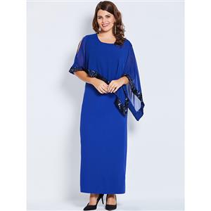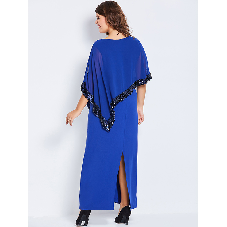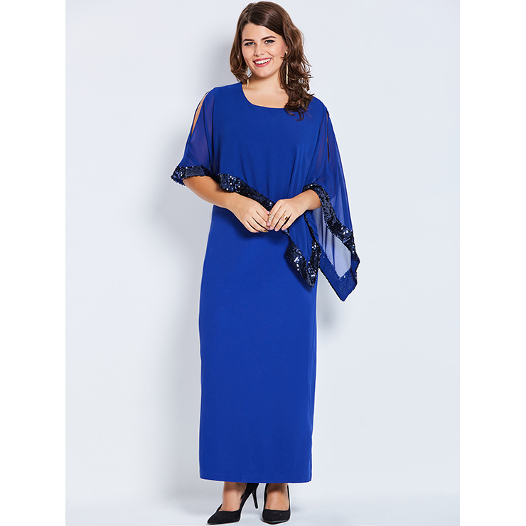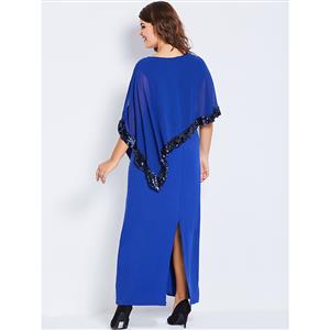 The plus size blue maxi dress featuring simple round neck design, half sleeve, ankle-length high-waist silhouette, with a extra layer and black sequins trim, split design at sleeve and back, hidden zipper at side. Occasions: suitable for party, date, go out, shopping, daily life and more(Only the dress).